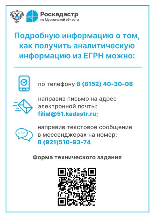 Для того, чтобы заказать аналитическую информацию, которая будет подготовлена под конкретный запрос, заинтересованному лицу необходимо подать обращение и предоставить проект технического задания. Предоставление аналитической информации на основе сведений, содержащихся в ЕГРН, на безвозмездной основе действующим законодательством Российской Федерации не предусмотрено.